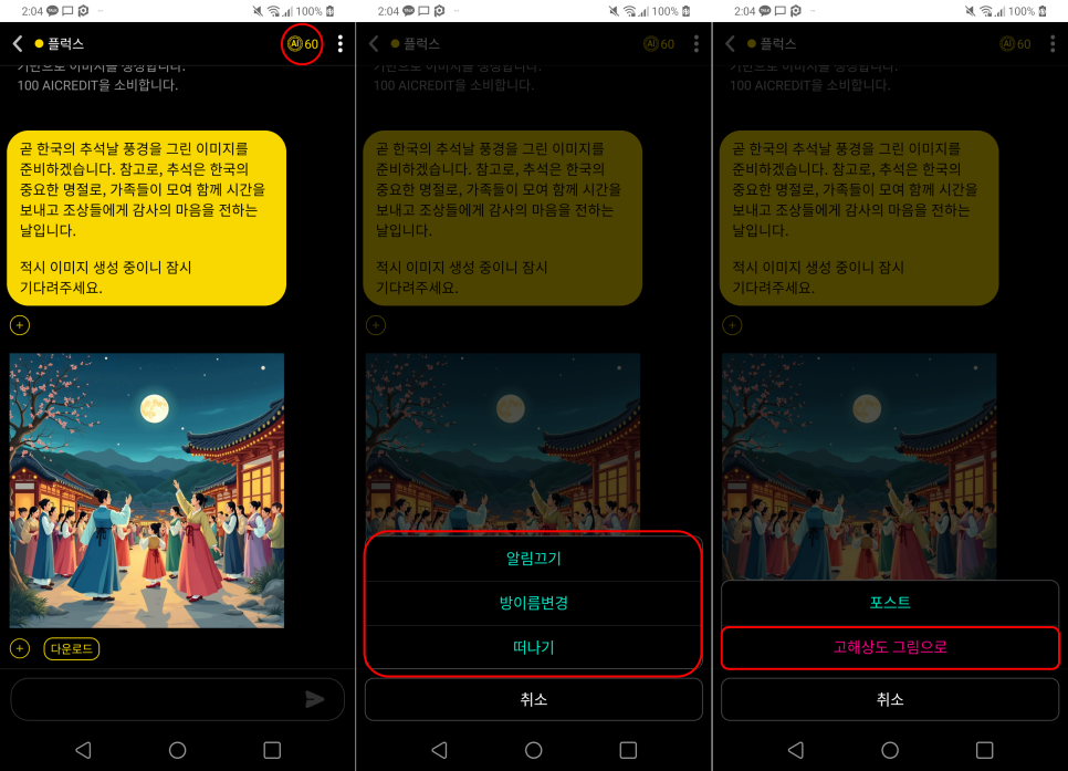 더보기 버튼 추가: 방 제목, 알림 설정 등을 변경할 수 있는 버튼이 추가되었습니다. 향후 AI 모델 설정 기능도 추가될 예정입니다.
